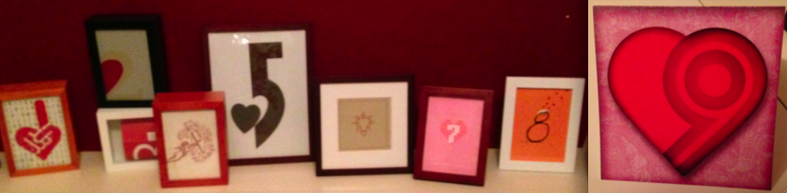 And for all my efforts, I have received more than I have given. My family has begun sending cards too—for birthdays, anniversaries and holidays. My in-laws even sent our dog a Christmas card containing money for visits to his favorite doggie daycare. (He’s really spoiled.) But by far the very best outcome has been that my husband, for each year since we’ve been married, has given me a custom-designed Valentine’s Day card featuring our anniversary year on the cover. This year marks our 9th Valentine’s Day together as a married couple and he continues to make me feel adored every day.